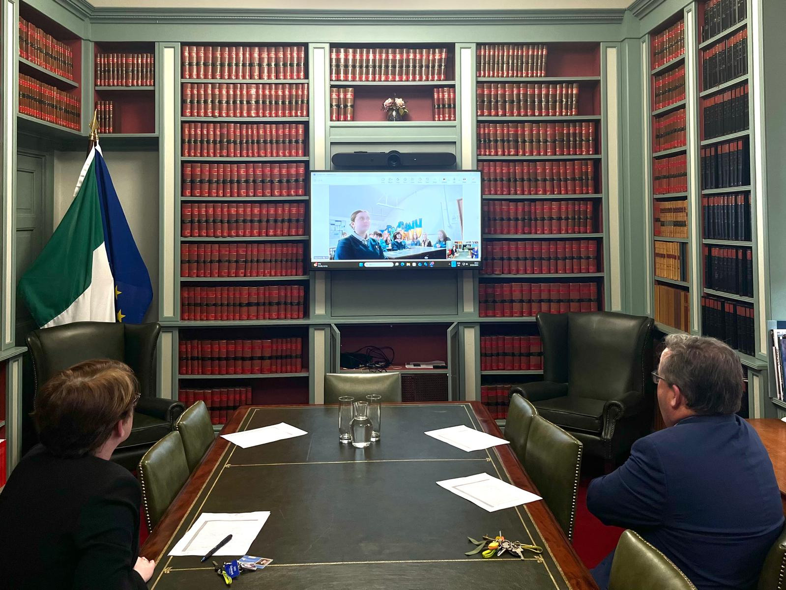 On Monday 27 April, the Supreme Court hosted a 'comhrá' with students of Hartstown Community School in Dublin 15. The students of Mr Melia's Politics & Society class spent an hour asking questions to Mr Justice Gerard Hogan of the Supreme Court and Ms Justice Siobhán Phelan of the High Court.